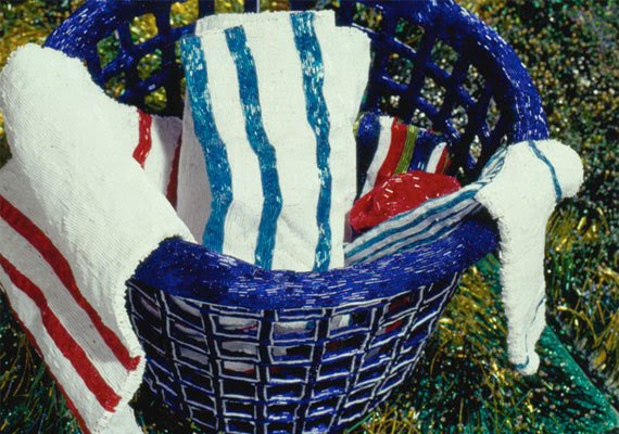 De infinita paciencia e imaginación se podría calificar el trabajo de Liza Lou, y de peculiar y altamente imaginativo también, porqué no. Porque, habeis de saber que, aparte del impacto visual que puedan tener o no sus imágenes cocineriles , lo más curioso de ellas es que están hechas completamente a base de perlitas y cuentas de vidrio adheridos y entretejidos con alambre y pegamento sobre formas de papel maché. No en vano se la conoce también como " La Reina de las perlitas" Su obra , más que pictórica, podría calificarse de escultórica, bordeando casi casi el espectáculo o incluso el interiorismo escenográfico.